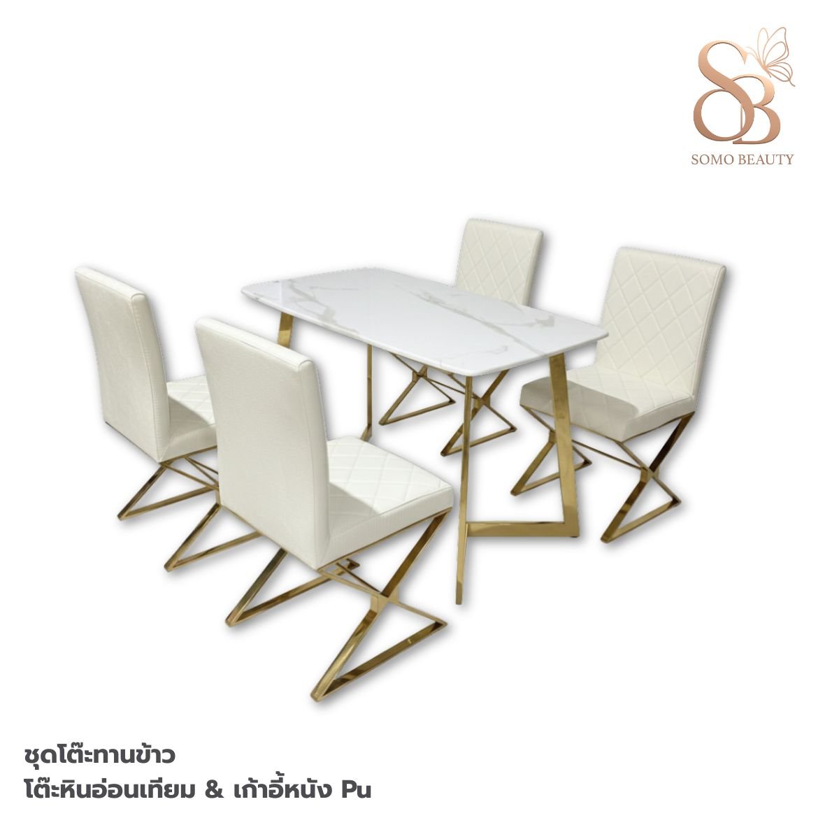 - โต๊ะหินอ่อน(เทียม) ขาสแตนเลสสีทอง มีน้ำหนัก- เก้าอี้หนัง pu ลายหนังจระเข้สีเหลี่ยมข้าวหลามตัด ขาสแตนเลสสีทอง